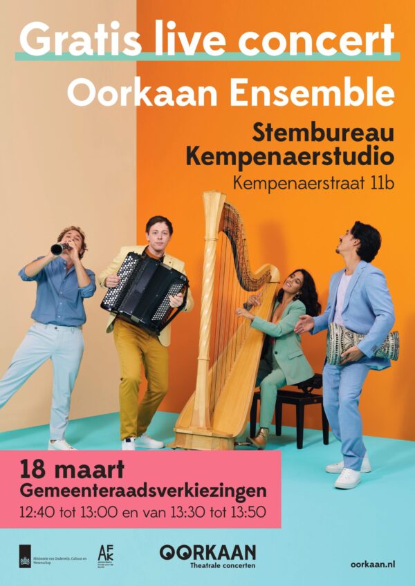 Stemmen met live muziek op de achtergrond: dat kan op woensdag 18 maart in de Staatsliedenbuurt in Amsterdam-West. In culturele broedplaats de Kempenaerstudio waar Oorkaan gehuisvest is, verzorgt het Oorkaan Ensemble een gratis mini-concert voor buurtbewoners die hun stem komen uitbrengen in het stembureau.